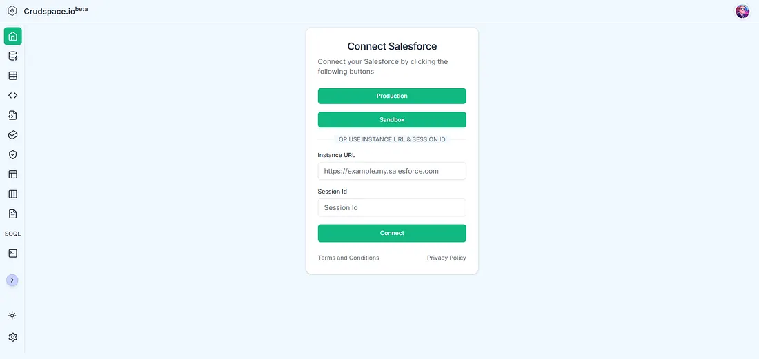 Next, connect your Salesforce organization. You can connect to a Production or Sandbox org with a single click, or use the Instance URL & Session ID for specific use cases.