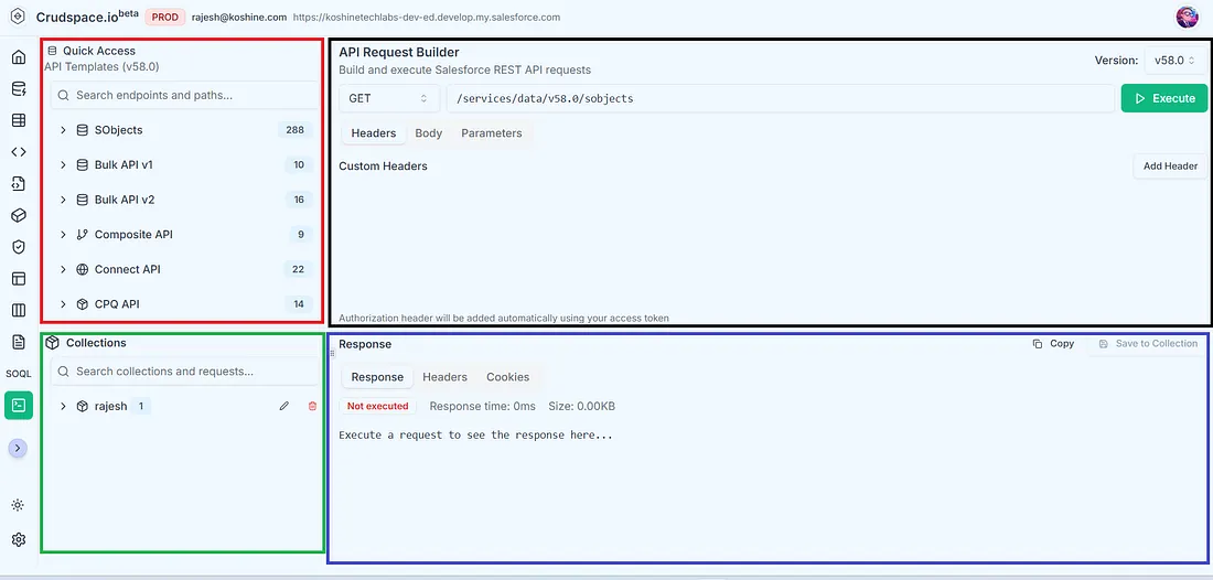 - (Red Section) API Templates: Don't know the exact endpoint? No problem. Browse our library of pre-built templates for common APIs like SObjects, Bulk API, and Composite API. Click on one — for example, Account under SObjects—to automatically populate the request URL. You can also type in your own custom endpoint. Remember, the instance URL is added for you!