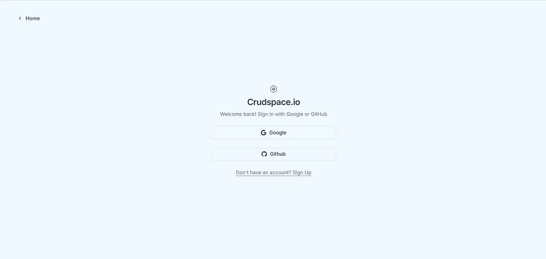 First, log in to crudspace.io using your Google or GitHub account. The process is quick and secure.